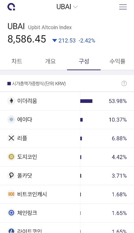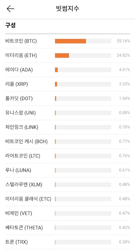 모든 상장 암호화폐를 대상으로 하며 당연히 시가총액이 큰 비트코인의 비중이 50% 이상을 차지합니다. 제가 비트코인을 삼성전자에 비유한 이유도 이것 때문입니다. 코스피지수에서도 삼성전자의 비중이 상당히 큽니다.