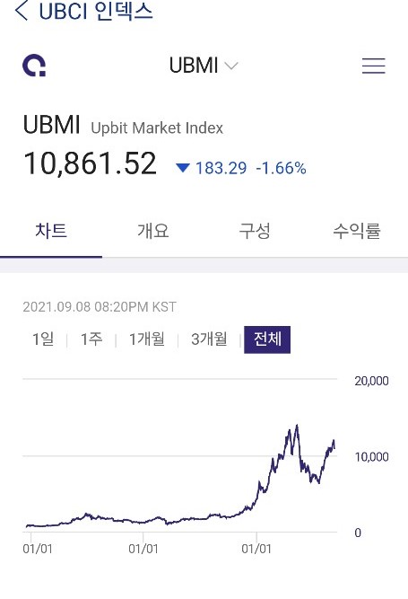 업비트에서는 UBCI인덱스라고 해서 세부적으로는 UBMI외 5개 그러니까 총 6개의 인덱스를 만들어 놓고 있습니다. 6개의 인덱스 중에서 전 종목을 대상으로 하는 UBMI와 비트코인을 제외한 종목으로 구성된 UBAI가 의미 있는 인덱스일 것으로 판단됩니다.