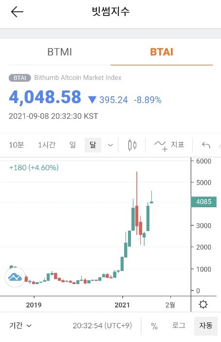 빗썸에서도 빗썸 지수라고 해서 BTMI와 BTAI 2개의 인덱스를 만들어 놓고 있습니다. 2개의 인덱스 중에서 전 종목을 대상으로 하는 BTMI와 비트코인을 제외한 종목으로 구성된 BTAI입니다.