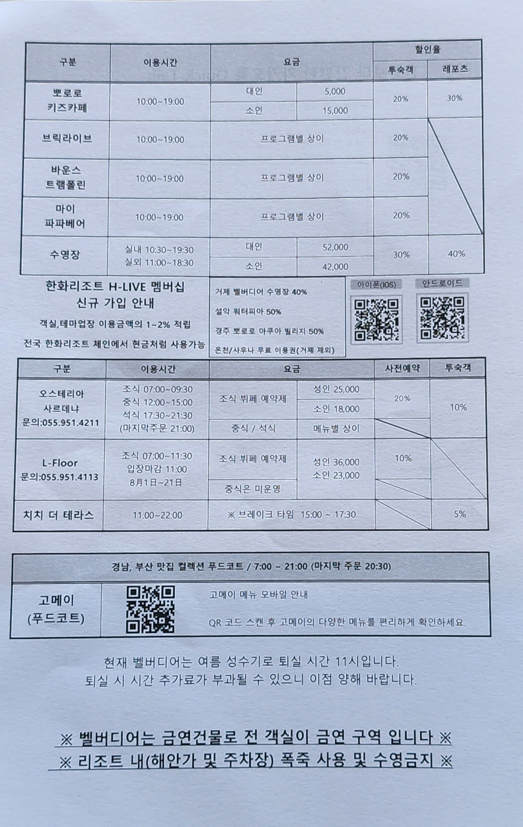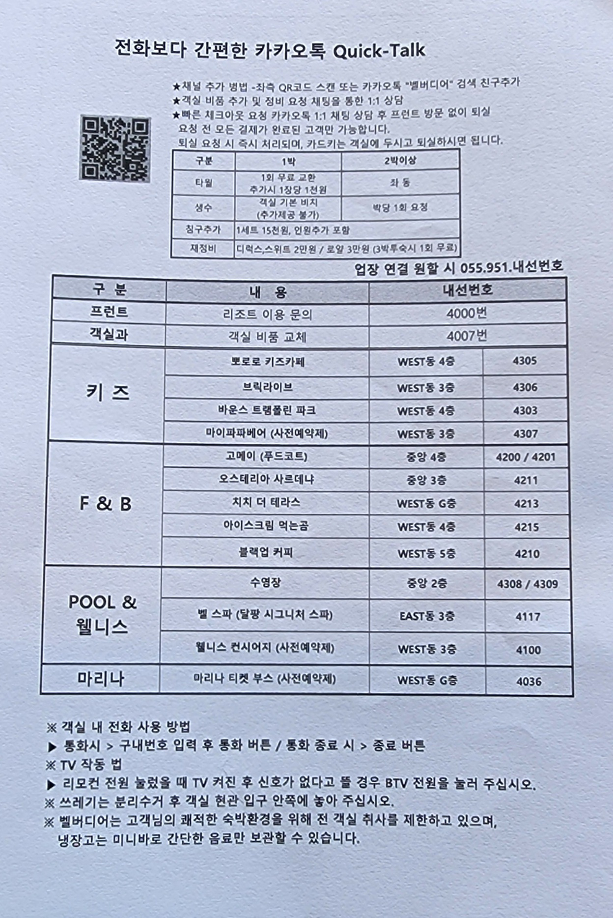 리조트 체크인을 하면 위 사진에서 보는 것 처럼 리조트 편의시설을 이용할 수 있는 안내장을 함께 주는데 QR코드를 이용해 간단하게 검색을 할 수 있게 되어있습니다.