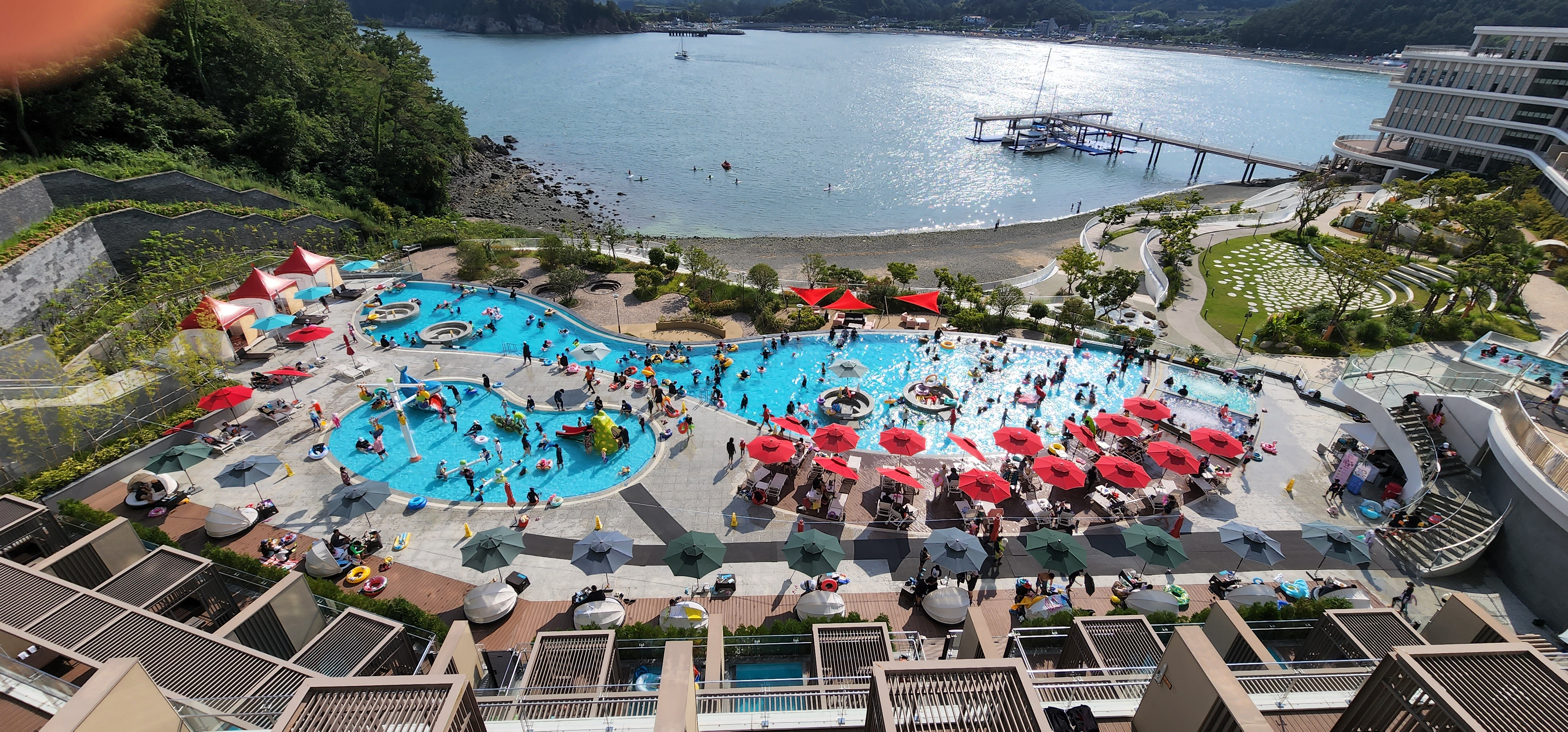 5층 로비앞에서 바라본 실외풀장에는 부모님들과 어린아이들로만 가득 차 있는데 청소년들이 놀기에는 수심과 분위기가 조금 부족해 보입니다. 초등이하 어린이들이 있다면 즐겁게 보낼만한 장소입니다.