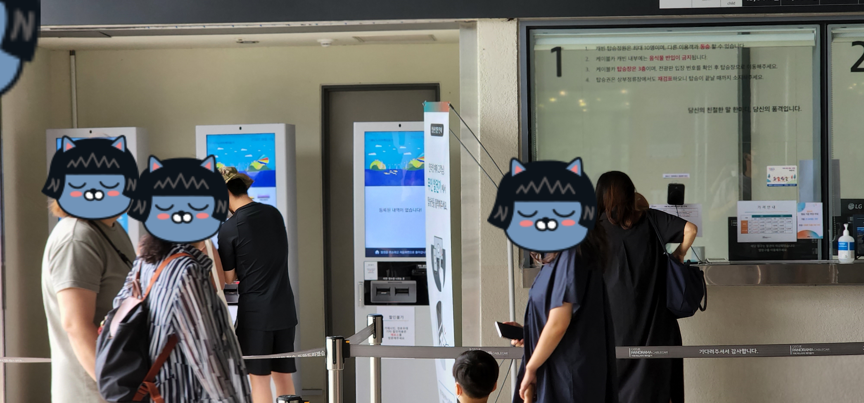 저희는 스스로 고소공포증이 있다고 생각하는 제 아내 때문에 투명바닥을 타지 못하고 불투명 바닥 캐빈을 예약해서 탑승했습니다. 투명 바닥은 대기인원이 조금 있으나 저희가 선택한 불투명 바닥 캐빈은 상행, 하행 모두 기다림 없이 바로 탑승할 수 있어서 좋았습니다.