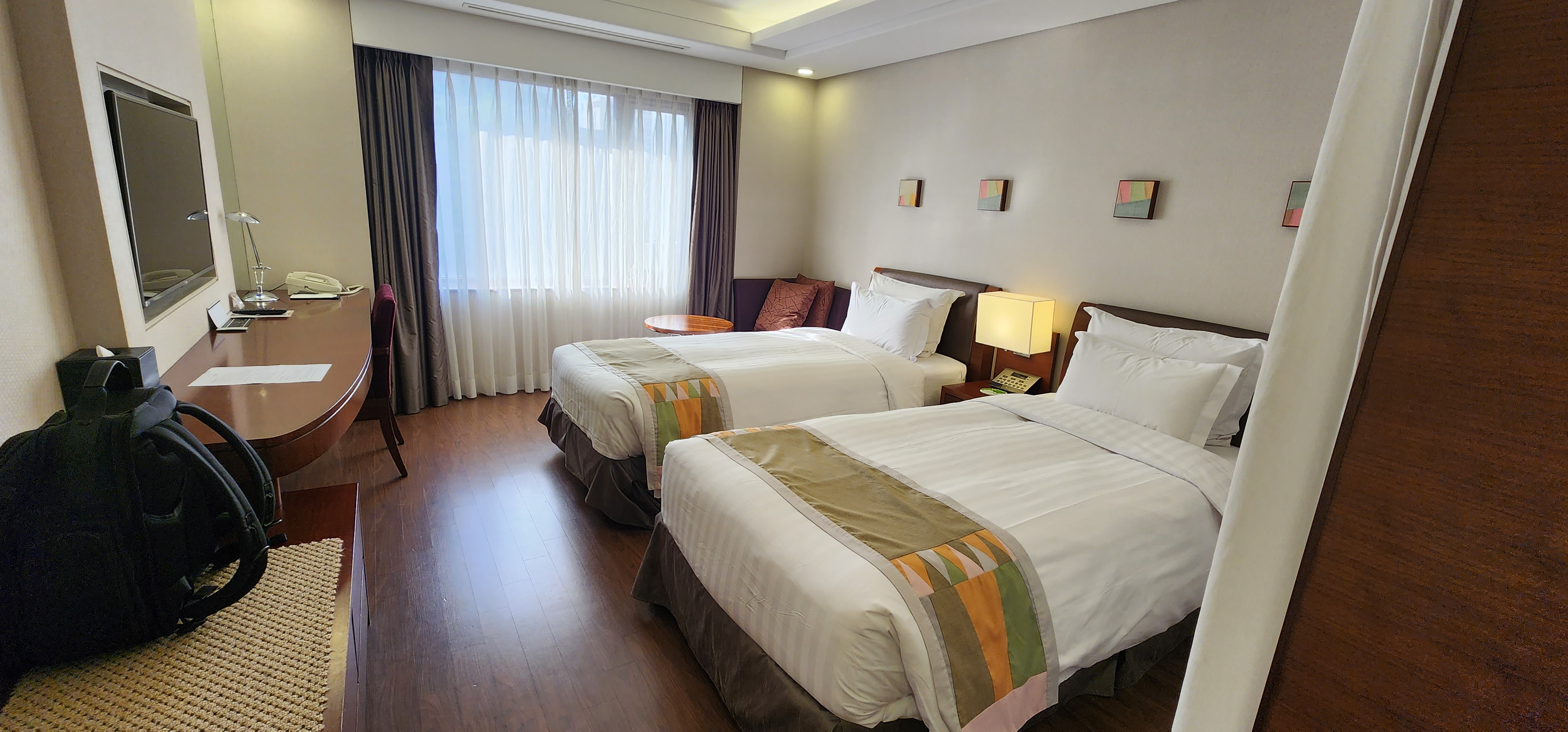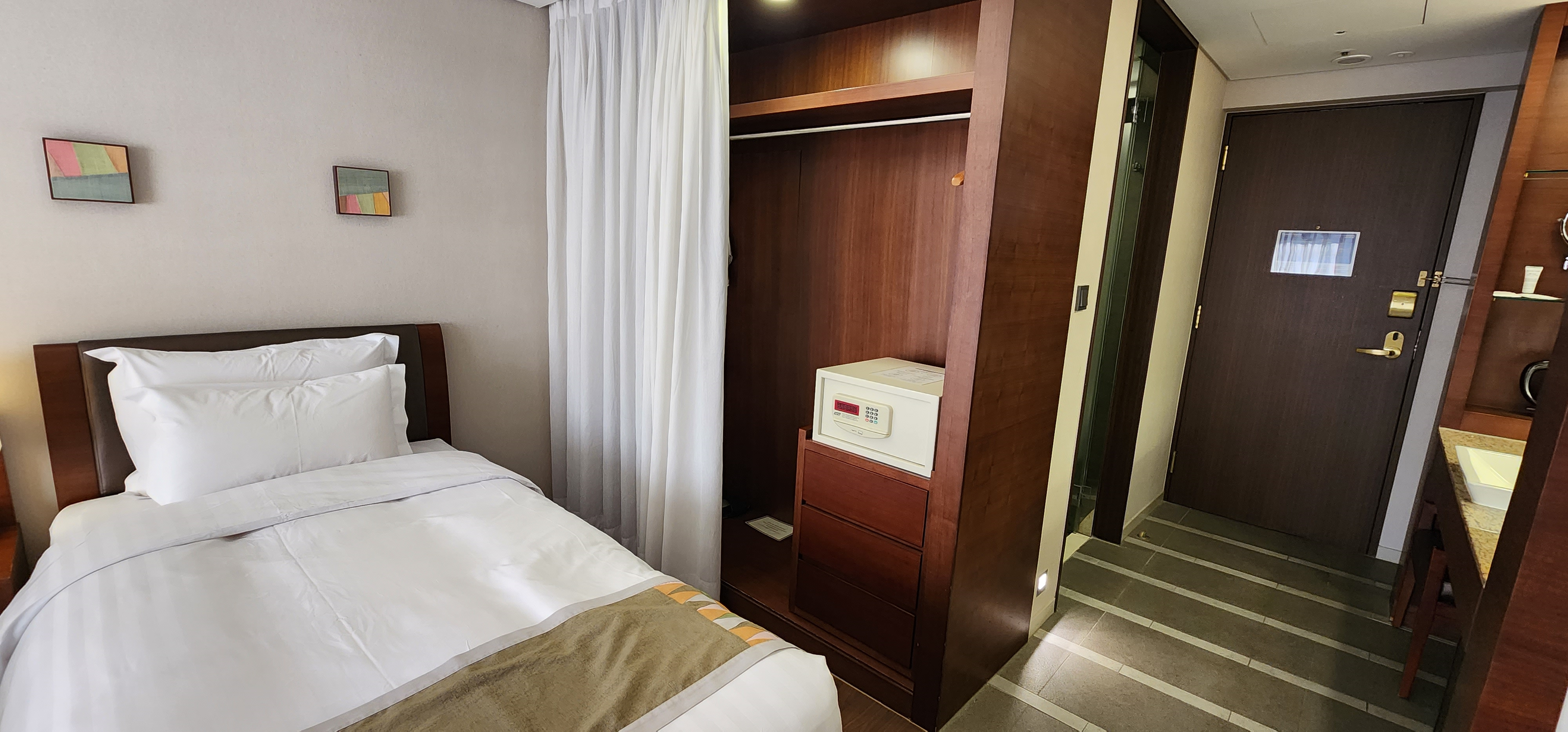 스탠다드 트윈룸인데 깔끔하고 아늑한 느낌이 듭니다. 전 객실이 금연룸이어서 그런지 기분 나쁜 냄새는 나지 않았고 오히려 목재향이 나는 듯 한 기분이었습니다. 저 침대하나만 사용할 것 같습니다. 이럴 땐 할인 안 해주남??^^