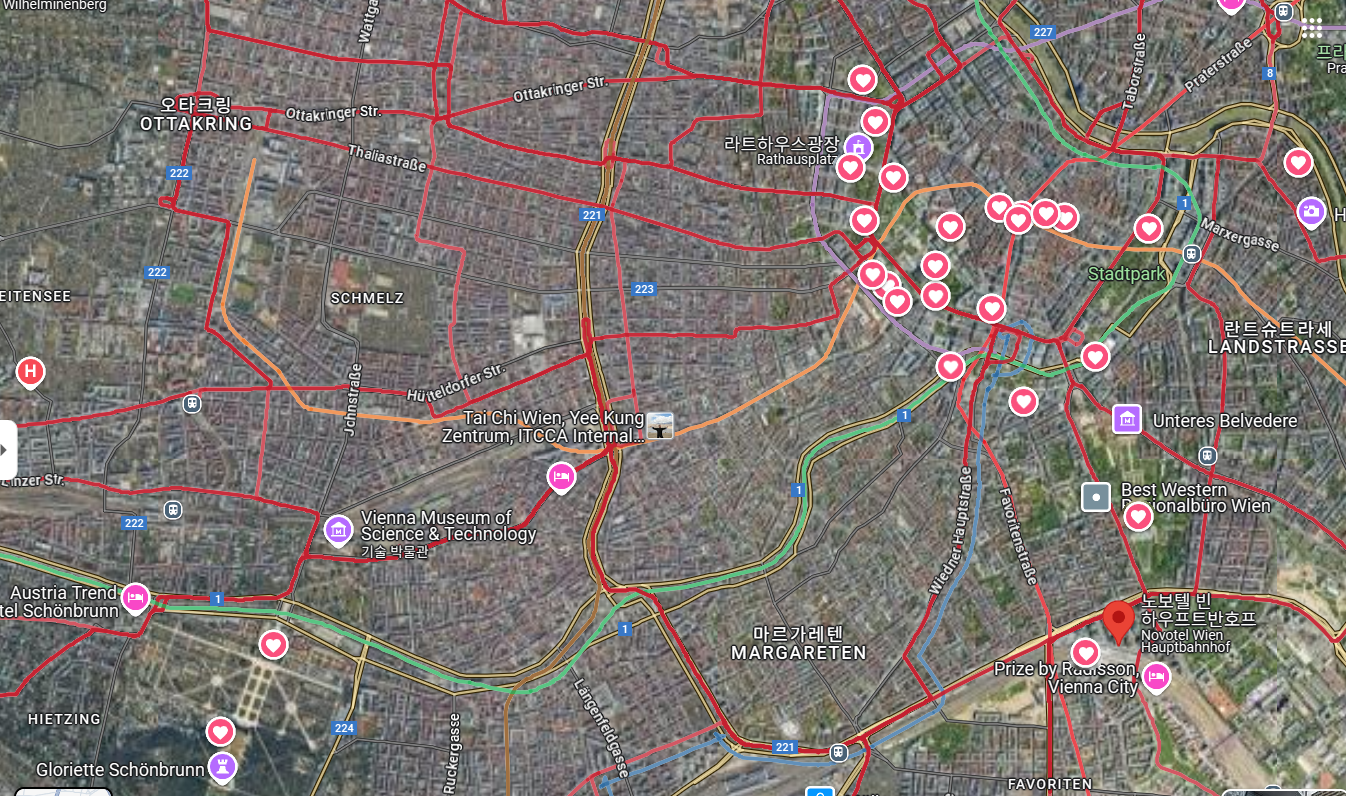 붉은 팔각형모양의 도로를 "링"이라 부른다, 옛날 성벽이었던곳을 허물고 도로를 만들었다고 한다. 빈은 이 링을 중심으로 관광하는 것이 국룰?이다. 중앙역 우리는 먼저 호텔 체크인을 하고 중앙역에서 허기를 채운 후 보티프교회까지 트램을 타로 이동해서 링을 따라 걸어서 슈테판 성당까지 갔다.