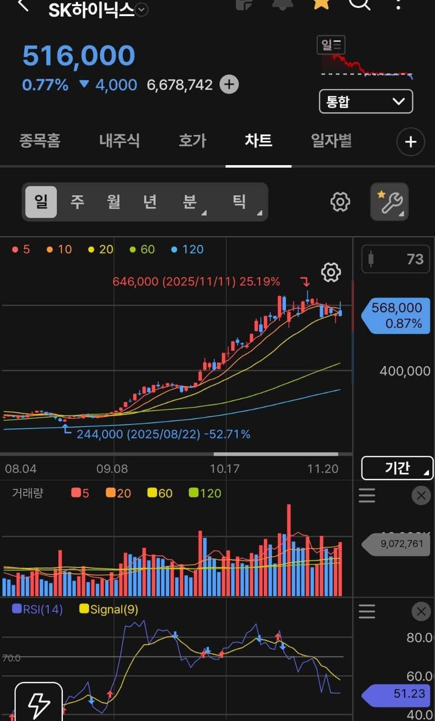 * 현상: 최근 646,000원 고점을 찍고 조정을 받으며 516,000원 부근에 위치해 있습니다. 5일, 10일 이동평균선이 꺾이며 단기 하락 추세가 진행 중입니다.
