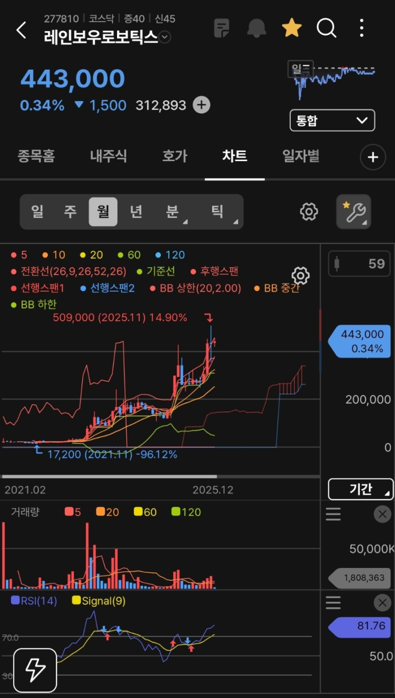 - RSI (81.76): 월봉상 RSI가 80을 넘는 것은 '광기'에 가까운 매수세를 의미합니다. 이는 삼성전자 자회사 편입이라는 강력한 모멘텀이 작용한 결과로 보이나, 장기적으로는 이격도 조정(눌림목)이 올 가능성도 염두에 두어야 합니다