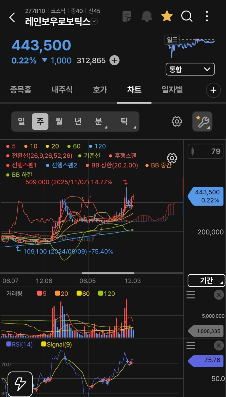 - 현황: 지난 11월 7일 기록한 역사적 신고가 509,000원을 기점으로 단기 조정을 거치고 있습니다. 급격한 상승 피로감을 해소하며 440,000원 대에서 지지력을 테스트하는 '기간 조정' 양상입니다.