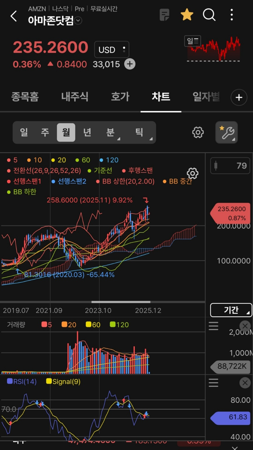 현재 상황: 주가는 $235.26입니다. 최근 고점을 찍고 단기 조정을 받고 있는 모습입니다.