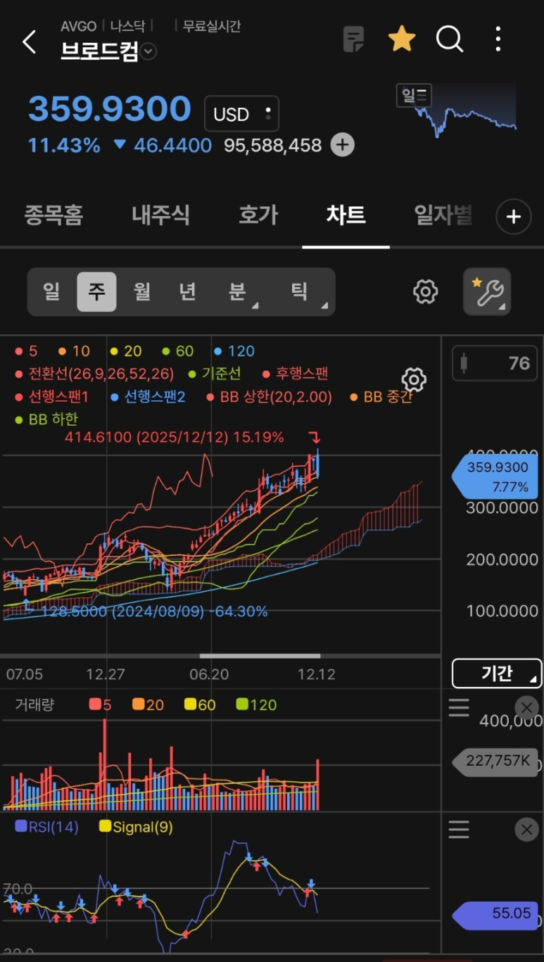 전망: 역사적 신고가 랠리 중이며, 장기 투자자에게는 여전히 매력적인 보유 구간입니다. 다만 이격도(이동평균선과 주가의 간격)가 많이 벌어져 있어, 월봉상 5개월 선이나 10개월 선까지의 기간 조정 가능성은 열어두어야 합니다.