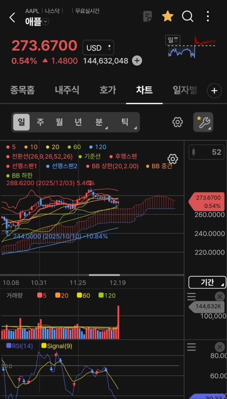 전망: 단기적으로 $280 선 돌파 시도가 예상되며, 눌림목 발생 시 20일 이평선이 지지선 역할을 할 것으로 보입니다.