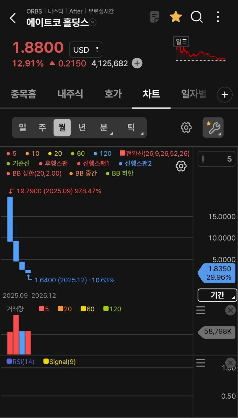 큰 그림: 월봉 차트는 이 종목이 얼마나 변동성이 큰지를 적나라하게 보여줍니다. 9월의 거대한 상승분(윗꼬리)을 모두 반납하고 제자리로 돌아왔습니다. 이는 전형적인 '펌프 앤 덤프(Pump and Dump)' 혹은 이슈 소멸 후의 차트 형태입니다.