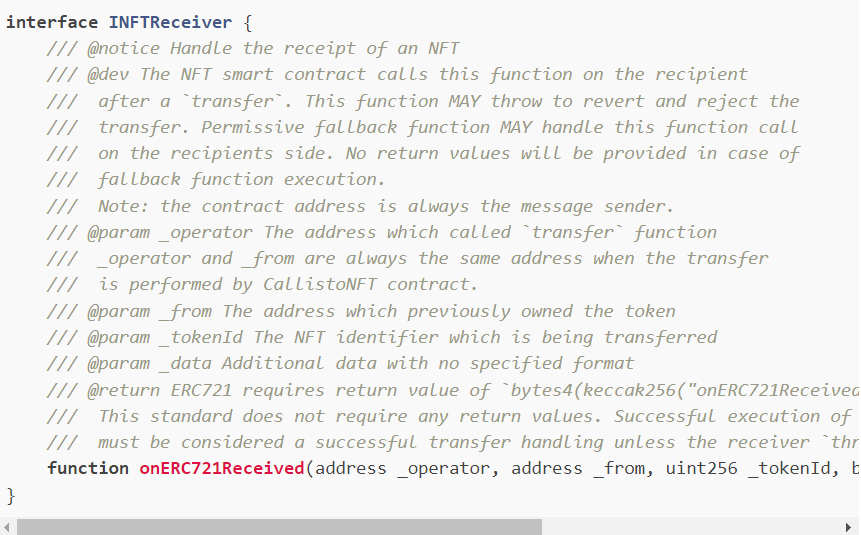 ERC721은 가장 널리 사용되는 NFT 표준입니다. CallistoNFT는 ERC721 및 onERC721 Received(...) 기능과 동일한 통신 모델을 사용하여 전송 처리를 제공합니다.
